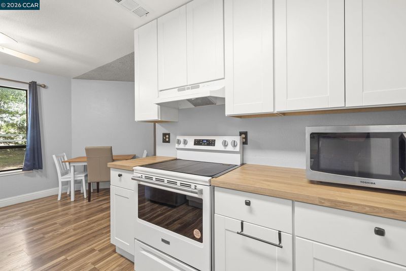 - Dishwasher, Electric Range, Microwave, Breakfast Nook, Counter - Solid Surface, Electric Range/Cooktop, Updated Kitchen